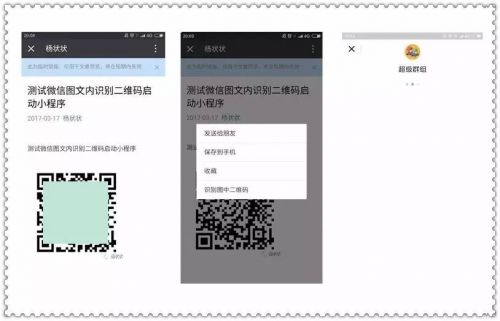 將小程序的二維碼扔到一個群里,然后點擊二維碼放大后長按,選擇“識別途中二維碼”,竟然可以直接啟動小程序,如果沒有安裝這個小程序,也會正常的進行安裝;