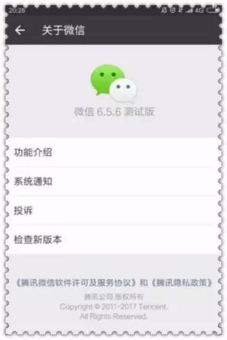 需要特別說明的是,楊狀狀的小程序“超級群組”和大家的一樣,并沒有獲得什么特權。唯一不同的是,微信版本是微信正常內部邀請的測試版本,版本號:6.5.6。目前微信版本6.5.5就無法在上述的場景下啟動、進入微信小程序。